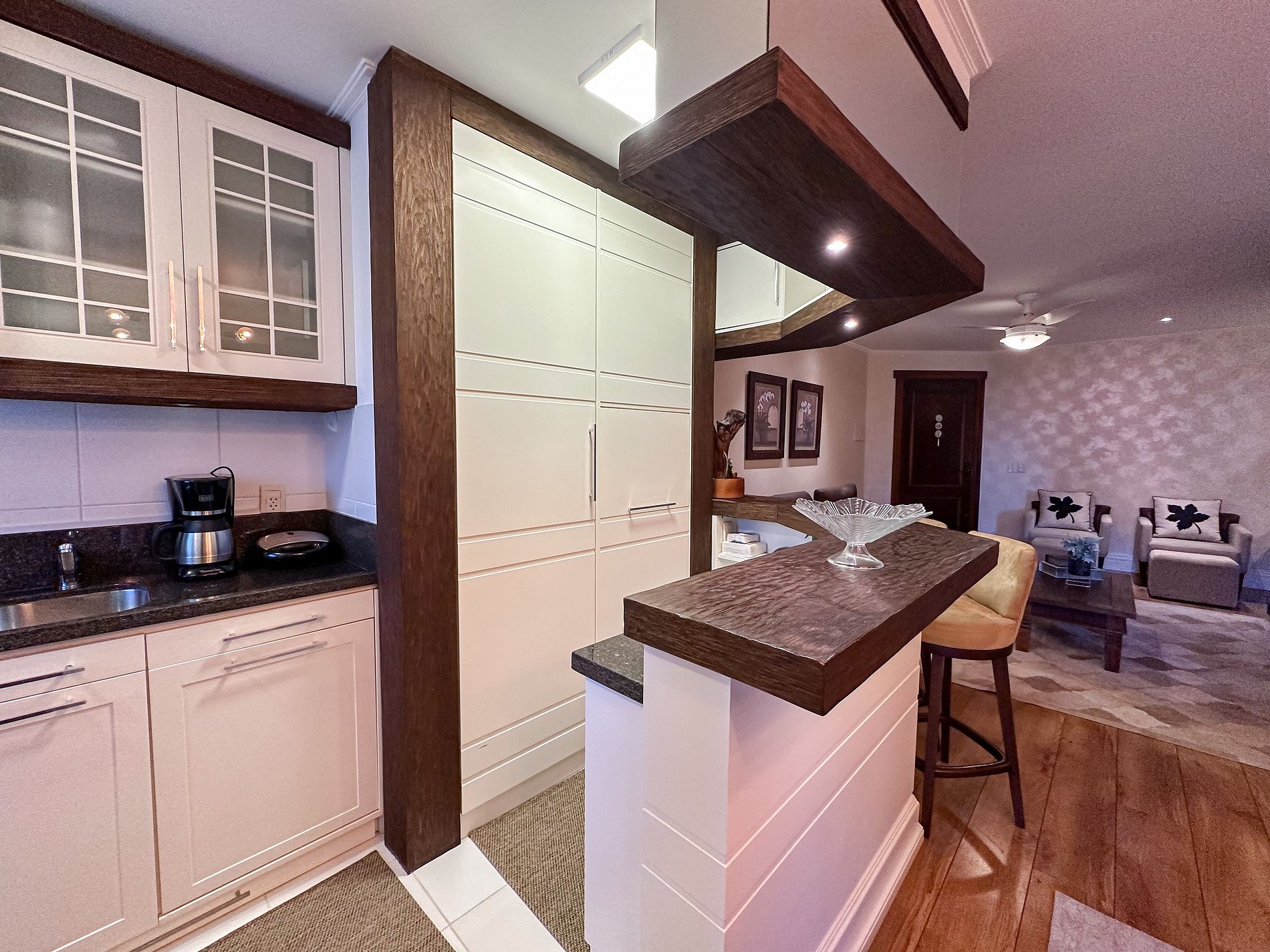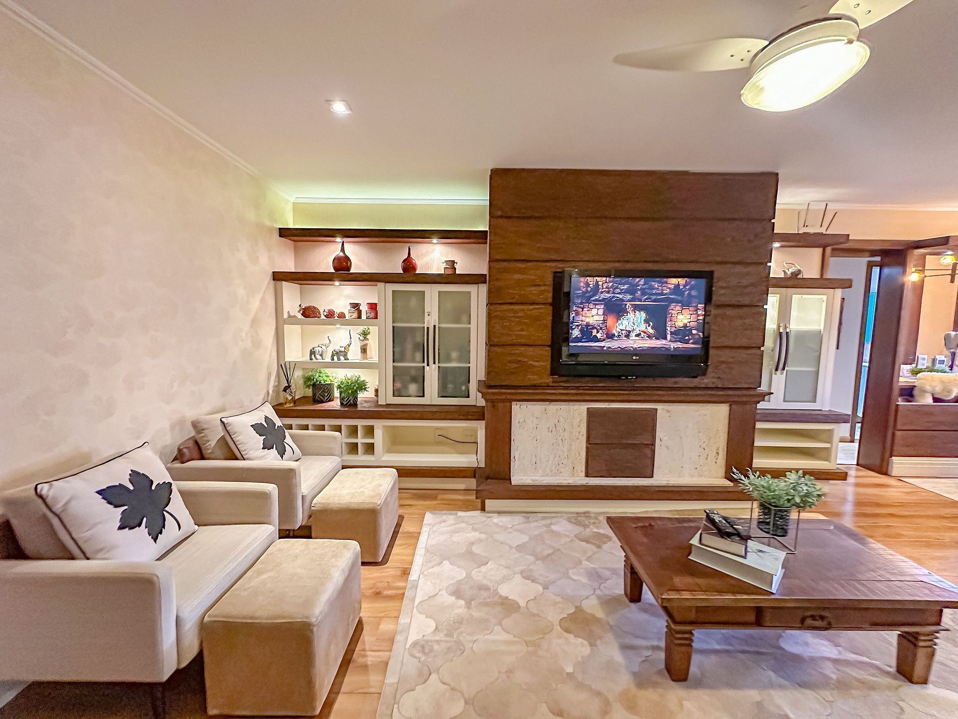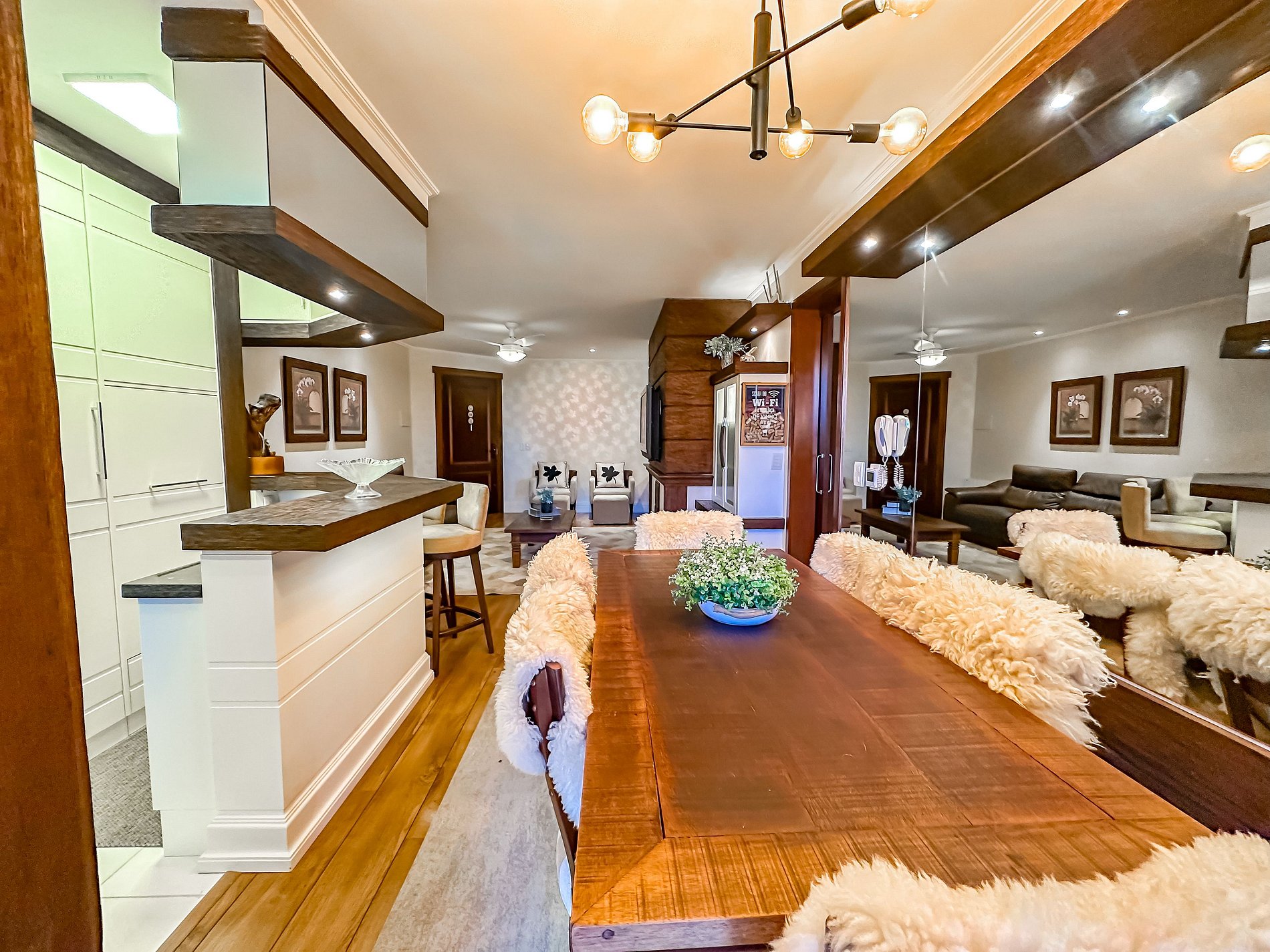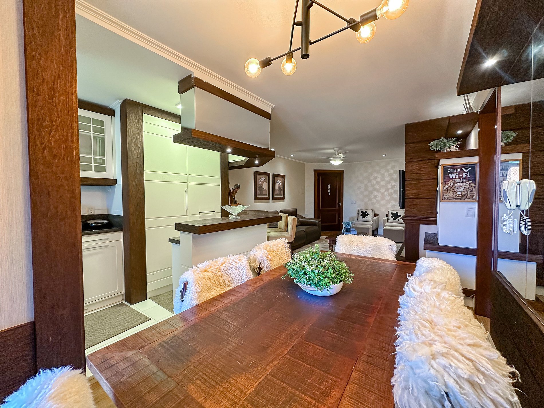 Dispõe de Wi-Fi, Smart TV na sala, além de uma cozinha equipada com todos os utensílios, vaga privativa com capacidade para dois carros e carregamento elétrico.