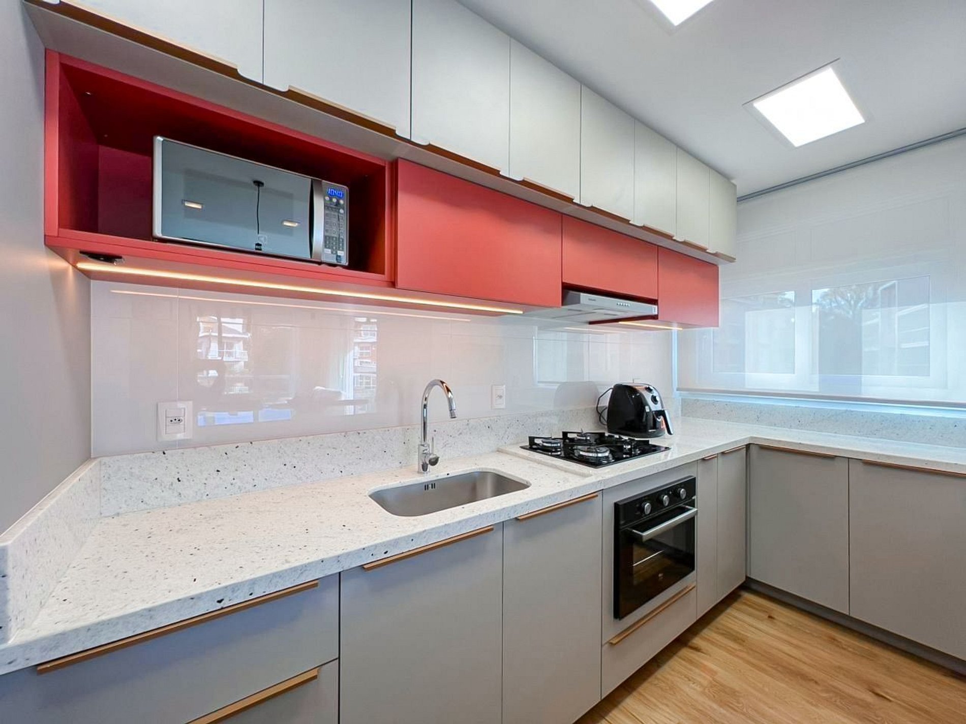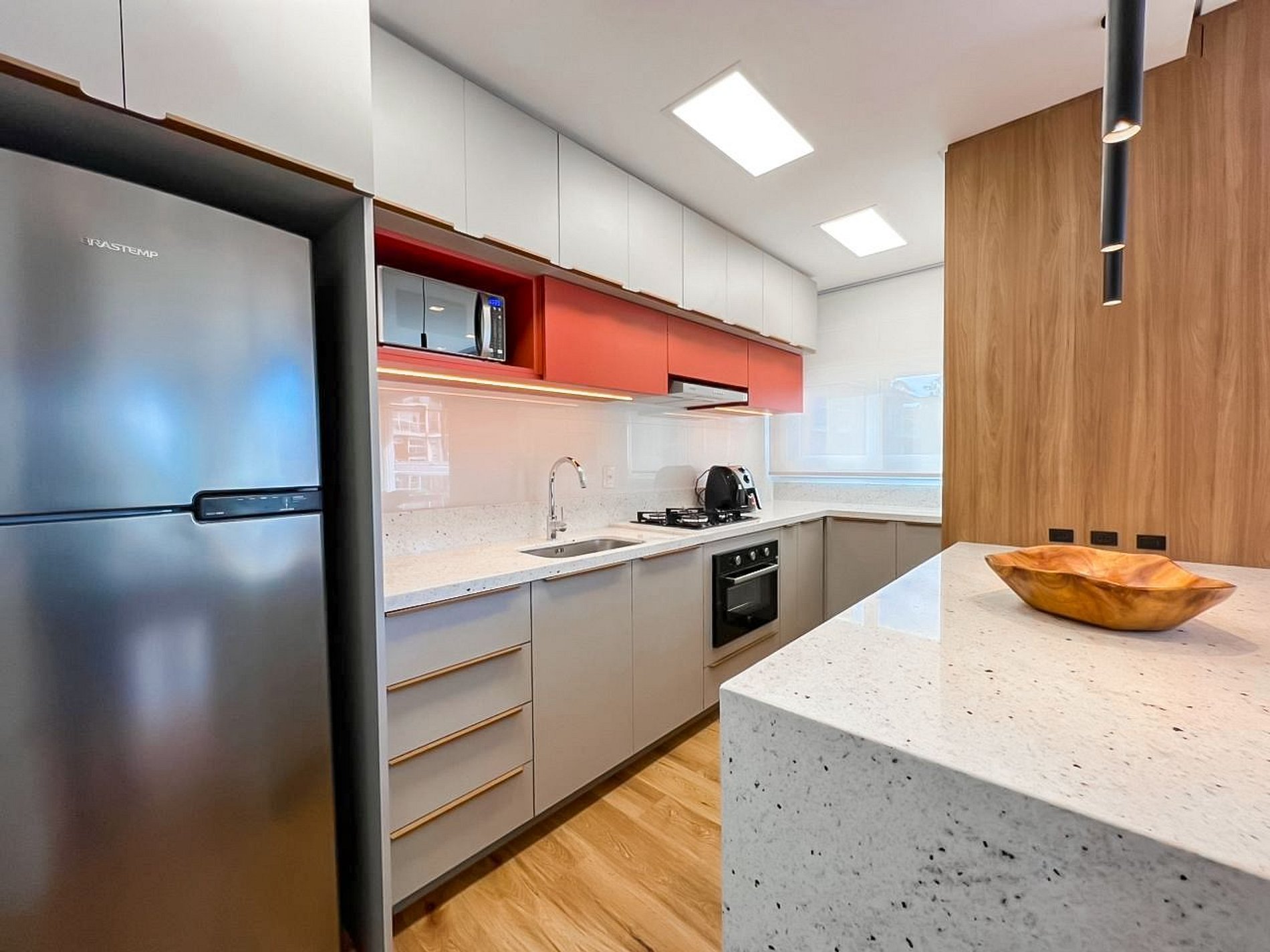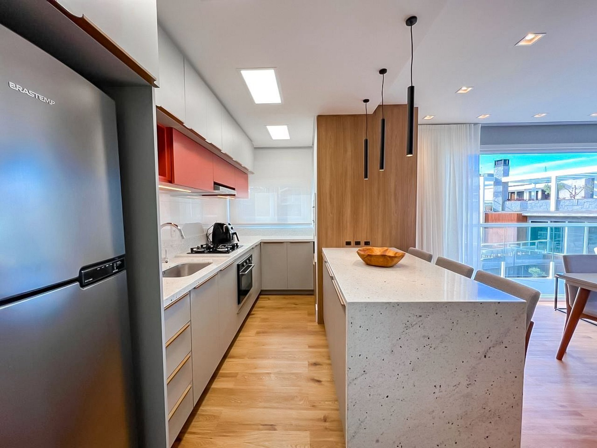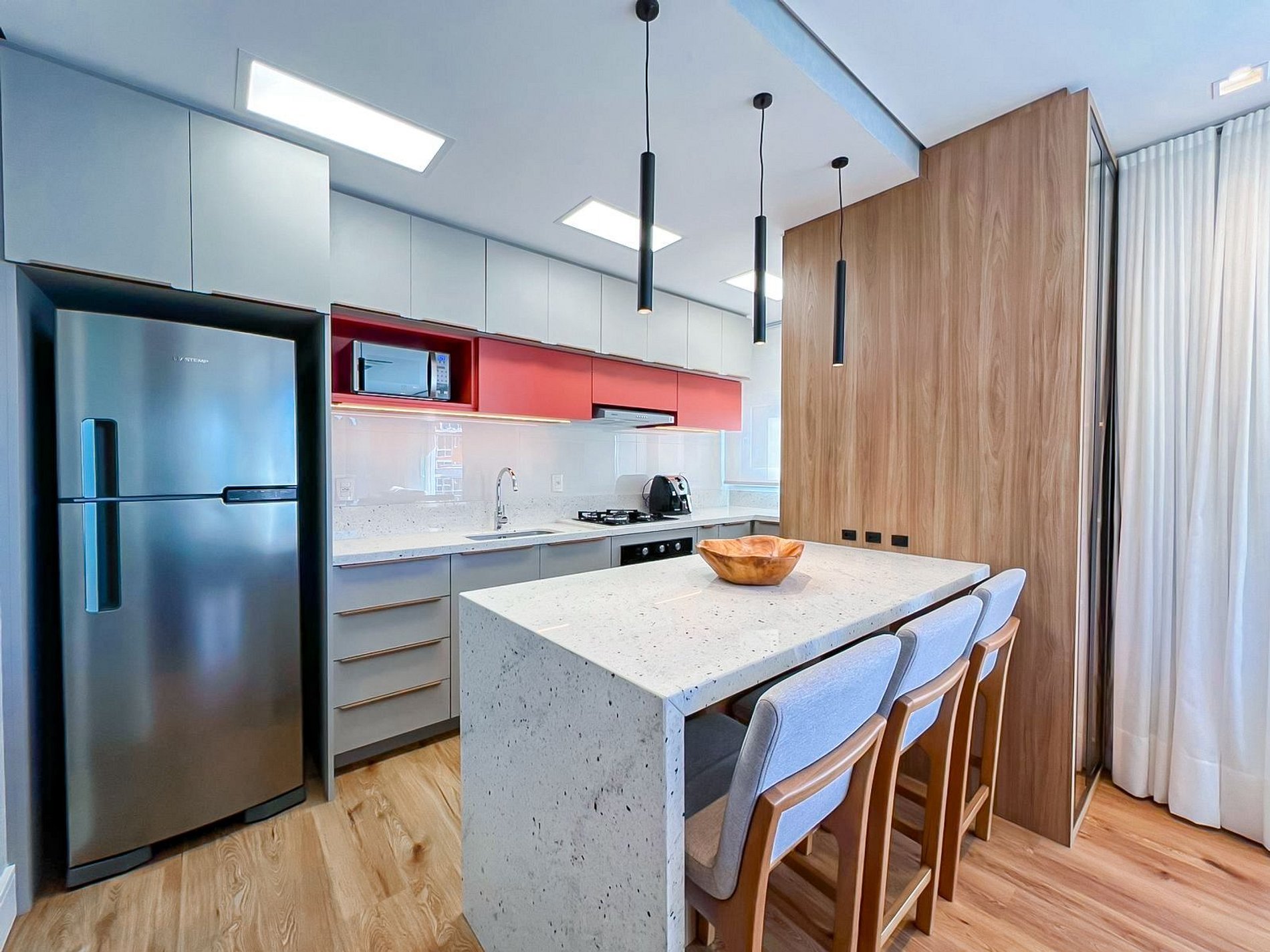 A cozinha é completa, com todos utensílios, eletros, incluindo diferenciais como air fryer, churrasqueira e espetos, tudo pensado para que sua experiência conosco seja incrível.