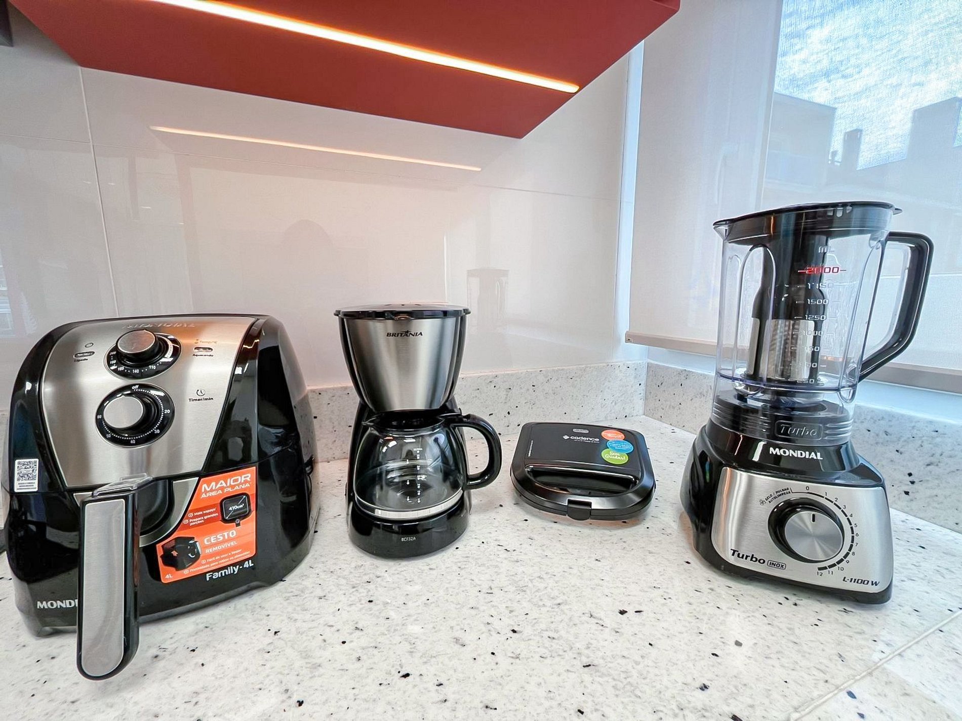 A cozinha é completa, com todos utensílios, eletros, incluindo diferenciais como air fryer, churrasqueira e espetos, tudo pensado para que sua experiência conosco seja incrível.