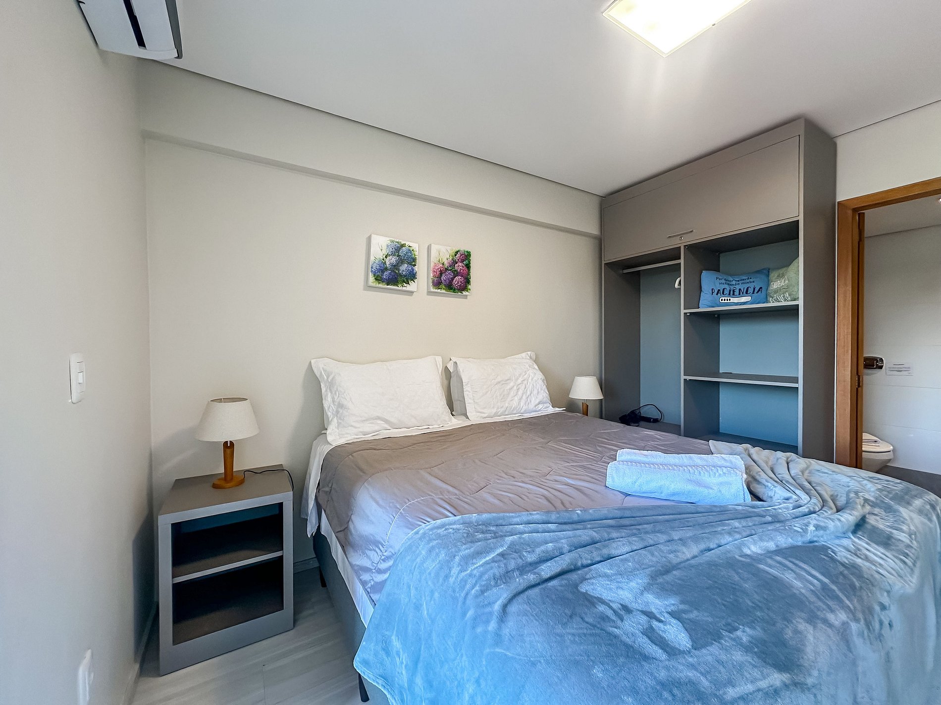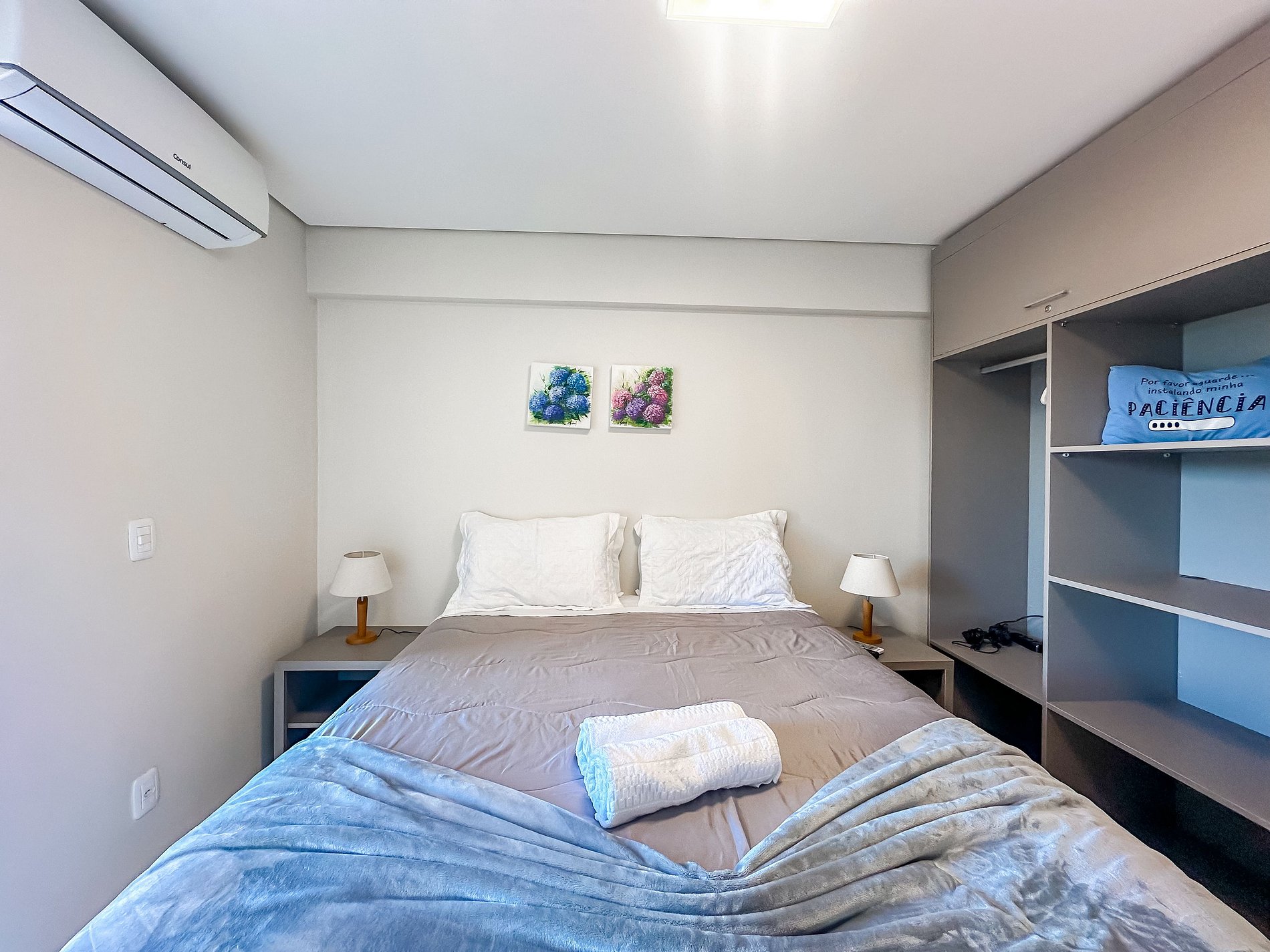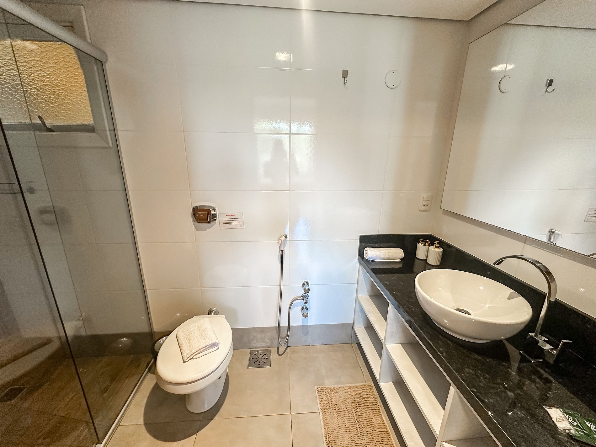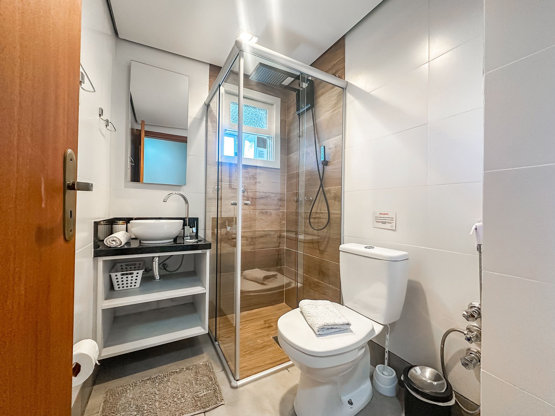 - 1 suíte (quarto com cama queen + banheiro + ar condicionado quente e frio);