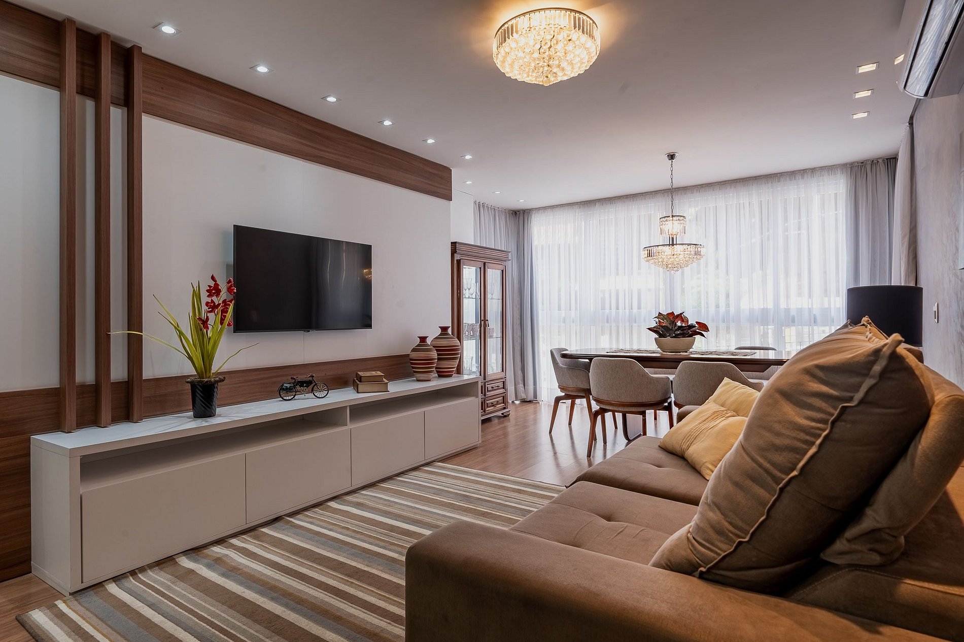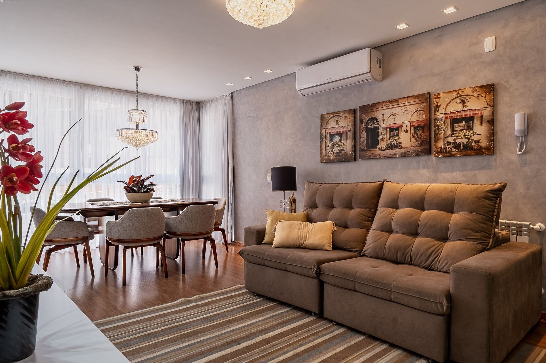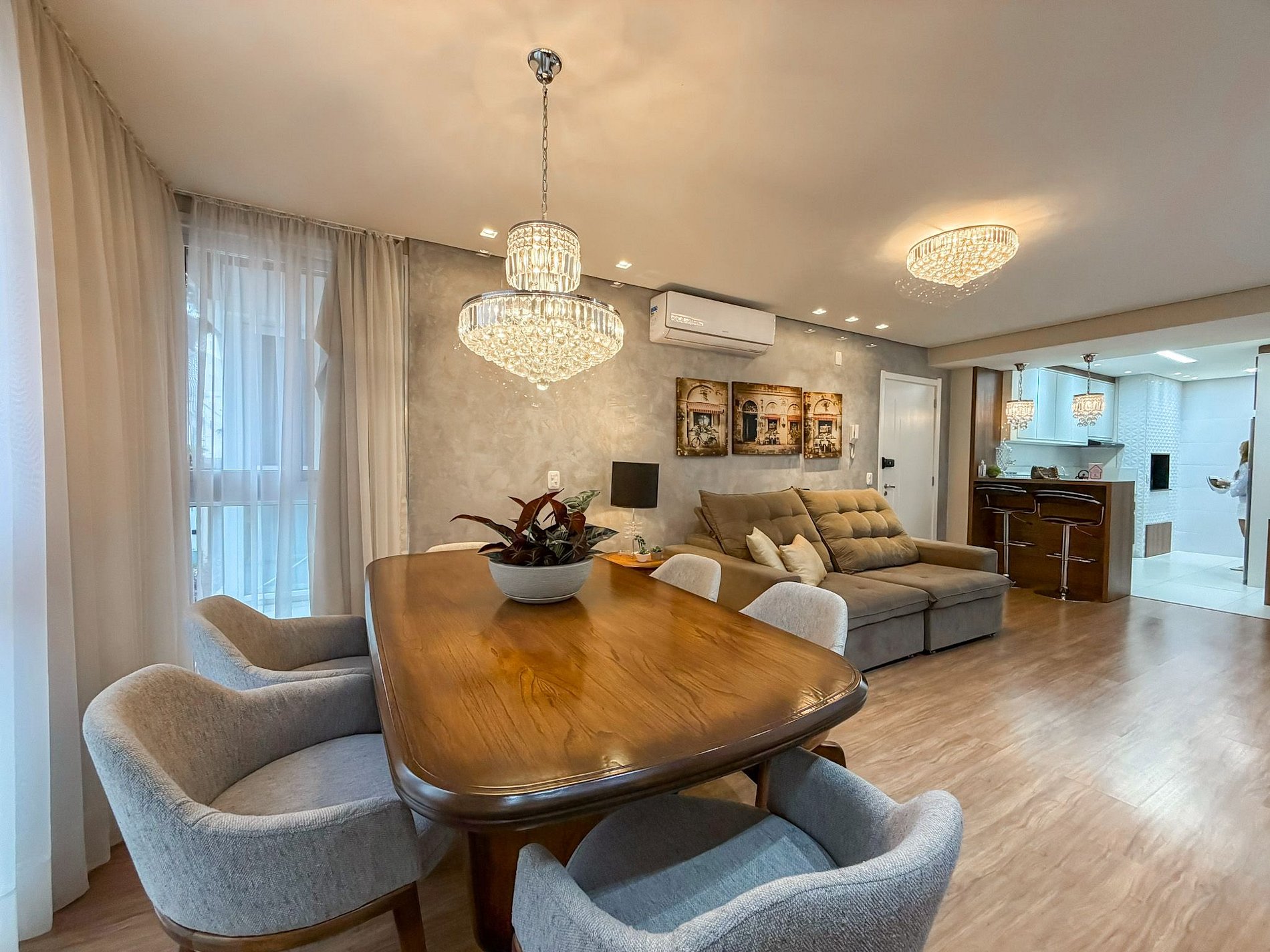 Ambientes amplos, bem iluminados e ventilados, com grandes janelas que deixam a luz entrar e trazem a beleza de Gramado para dentro do apartamento.