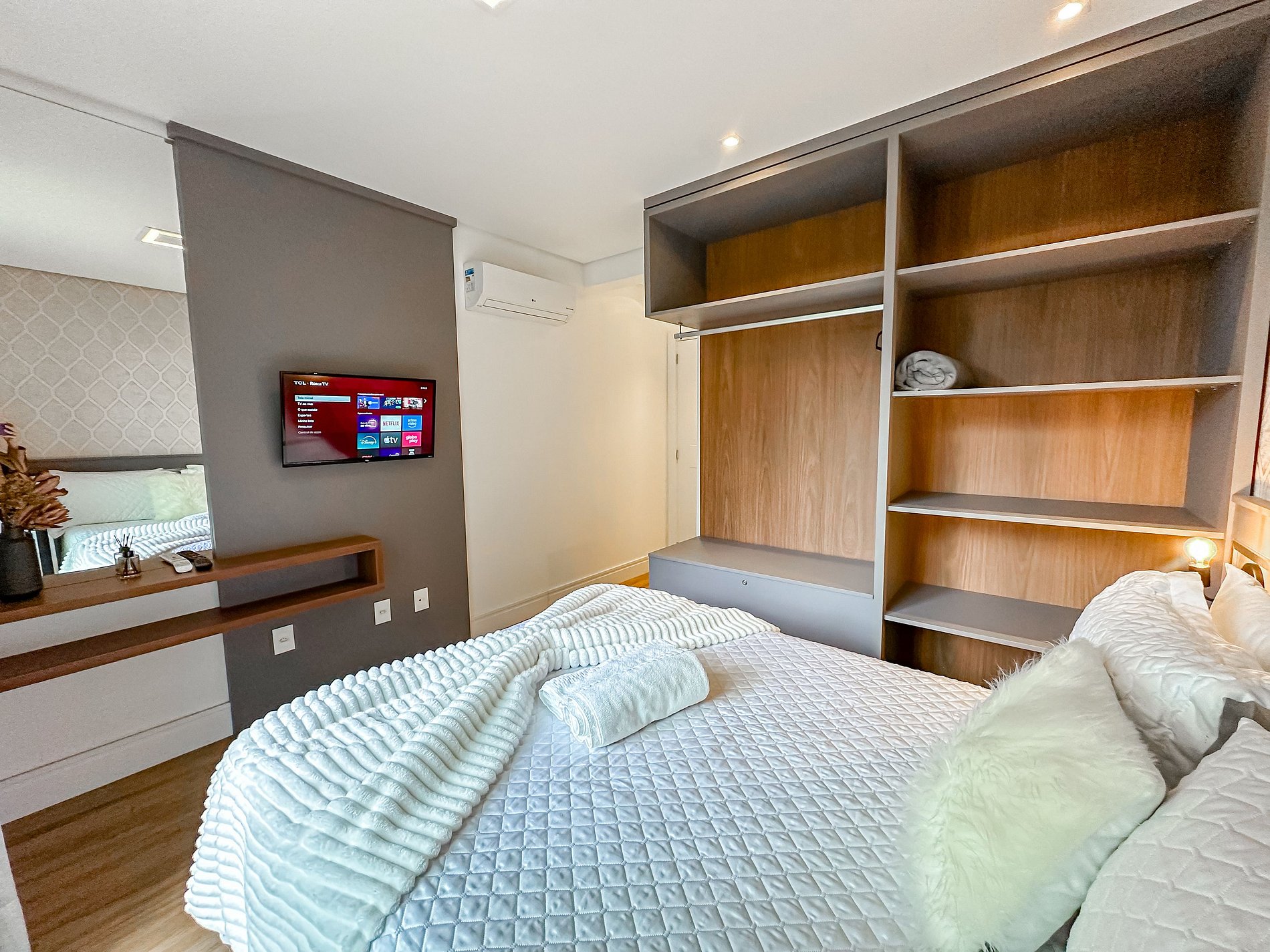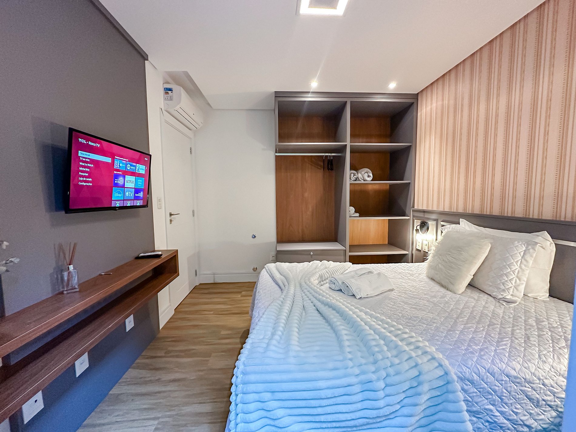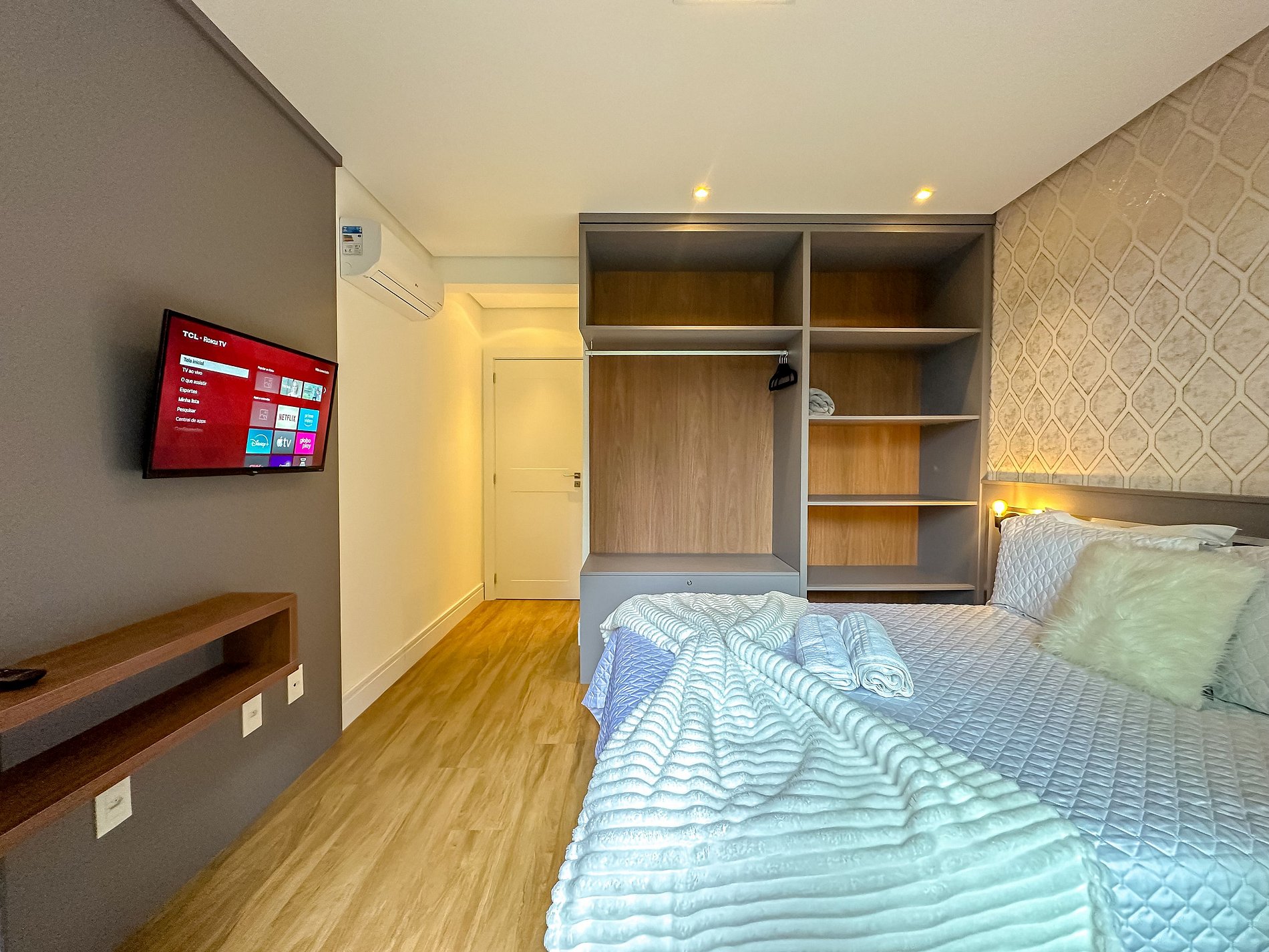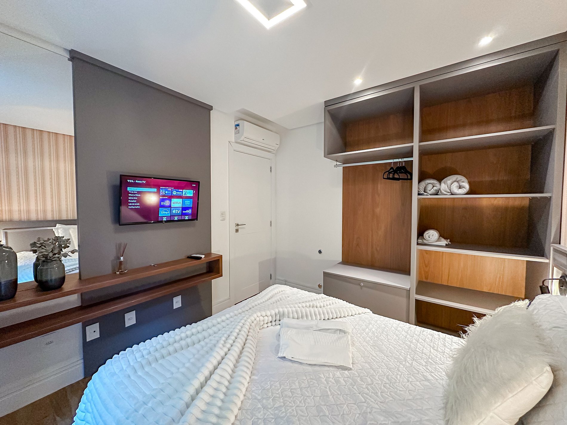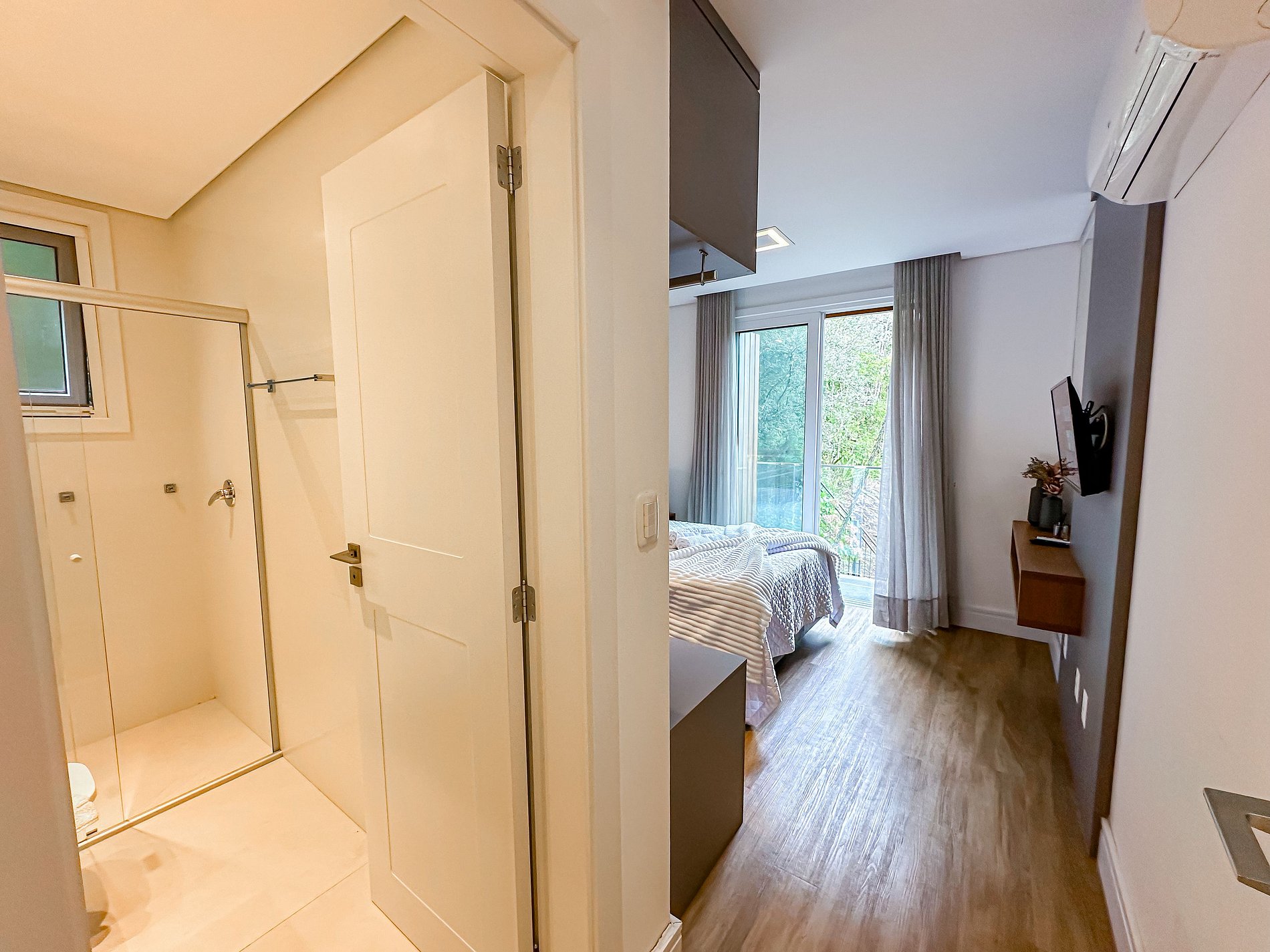 - 1 dormitório (quarto com cama casal + ar condicionado quente e frio + tv);